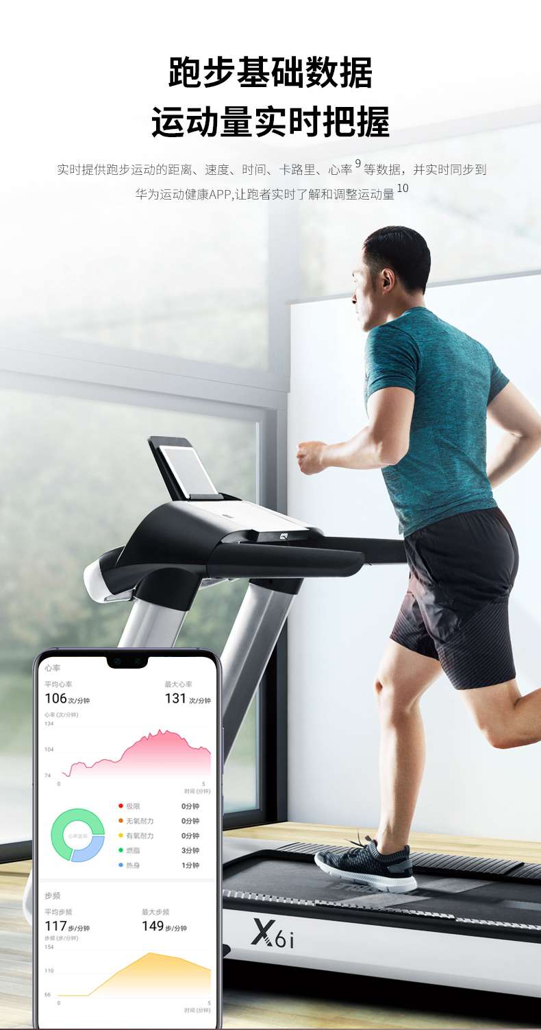 球王会跑步机-X6心率跑步机,可根据用户运动是实时心率,跑步机自动调节跑步速度、坡度等进行运动强度的调节,更科学;X6i华为版跑步机,可以通过连接华为运动健康APP,监测多种类型跑步数据。欢迎来电咨询~