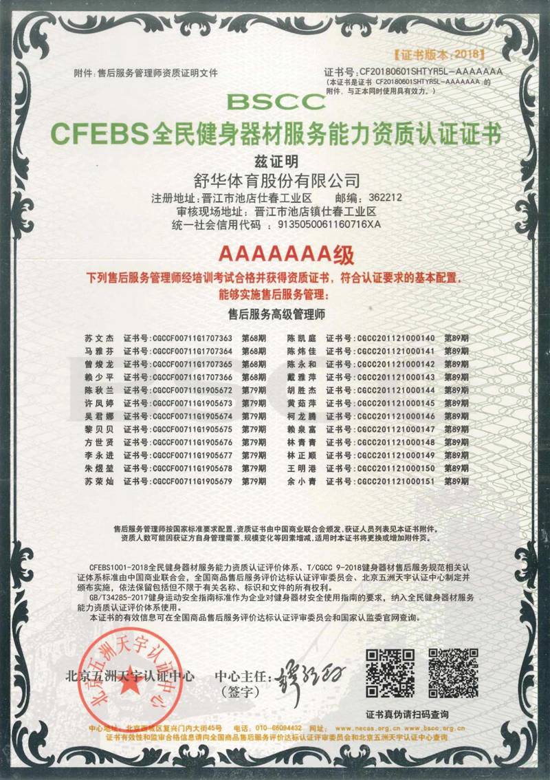 球王会以用户满意作为服务追求,凭借专业的技术能力及服务保障能力、有效的售后服务体系,获得“BSCC-CFEBS 全民健身器材服务能力资质认证证书 AAAAAAA 级”,部分员工经培训考试合格并获得“BSCC-CFEBS 全民健身器材服务能力资质认证证书-售后服务高级管理师(AAAAAA 级)。