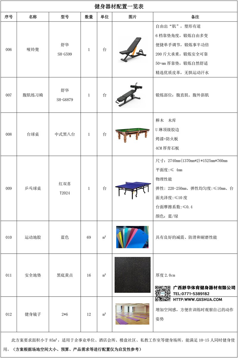 此方案要求面积小于85m²,适用于企事业单位、酒店会所、楼盘社区、私教工作室等健身场所,能满足10-15人同时健身使用。(方案根据场地空间大小、预算、产品需求等进行配置仅为启发性参考)
