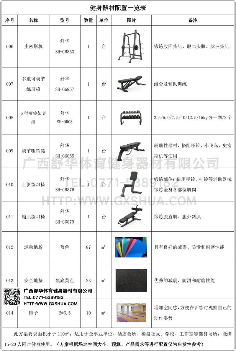 此方案要求面积小于110m²,适用于企事业单位、酒店会所、楼盘社区、学校、工作室等健身场所,能满15-20人同时健身使用。(方案根据场地空间大小、预算、产品需求等进行配置仅为启发性参考)